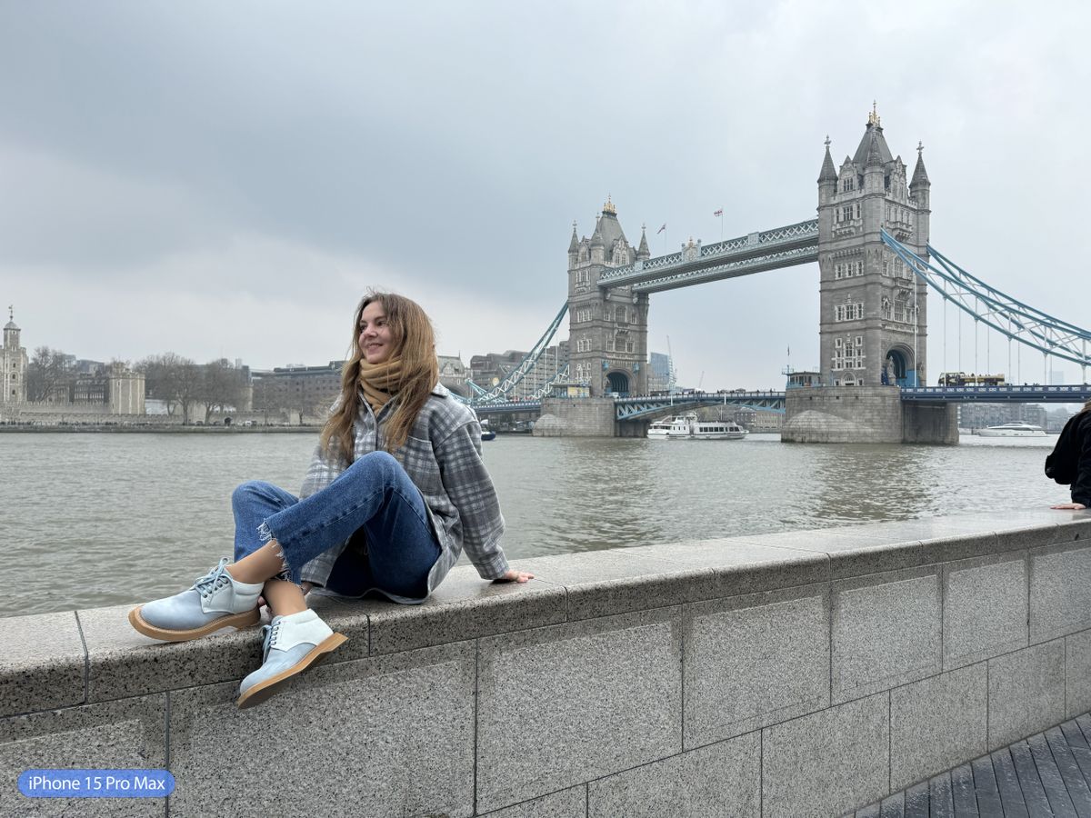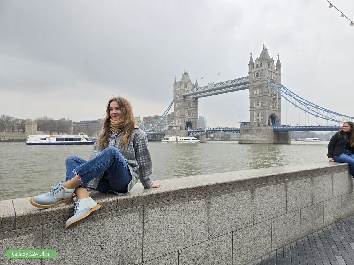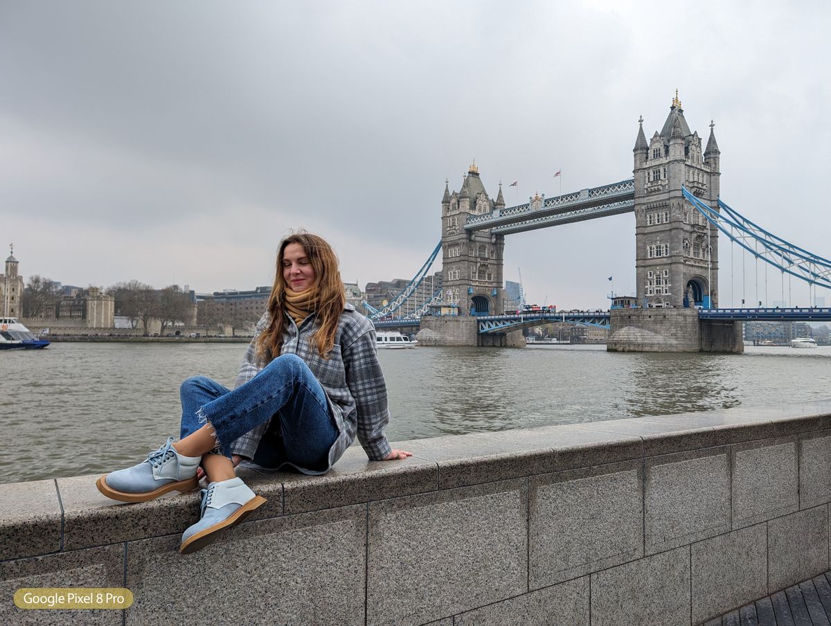 Был запечатлен Тауэрский мост и мост Миллениум в яркий и пасмурный день в Лондоне. На первом снимке девушка на фоне Тауэрского моста (вверху), а на втором — на фоне моста Миллениум (внизу).
