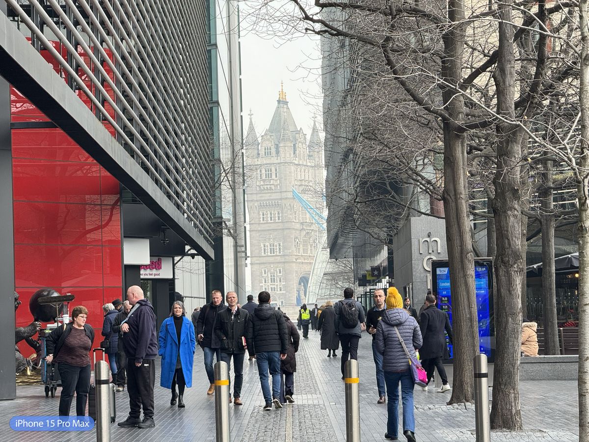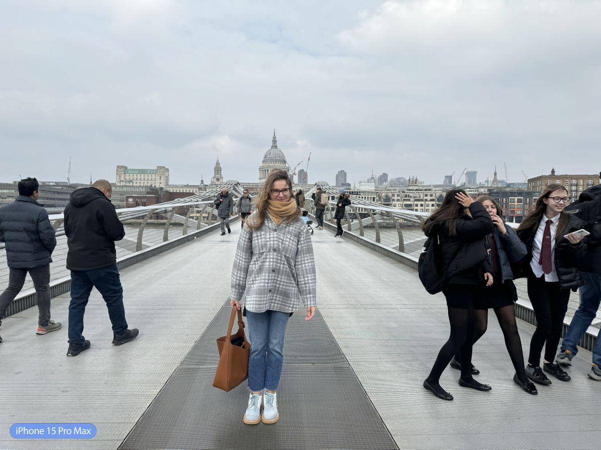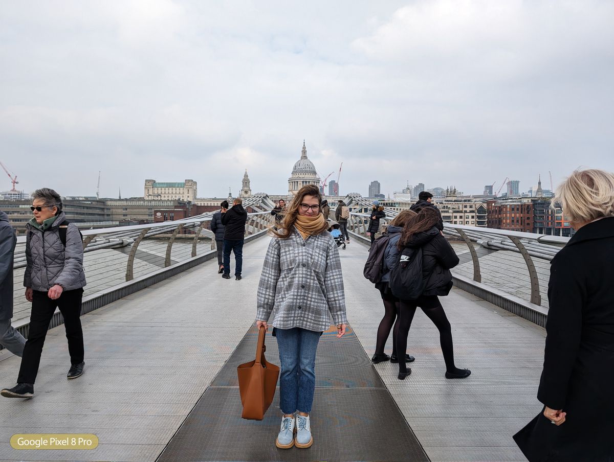 Был запечатлен Тауэрский мост и мост Миллениум в яркий и пасмурный день в Лондоне. На первом снимке девушка на фоне Тауэрского моста (вверху), а на втором — на фоне моста Миллениум (внизу).