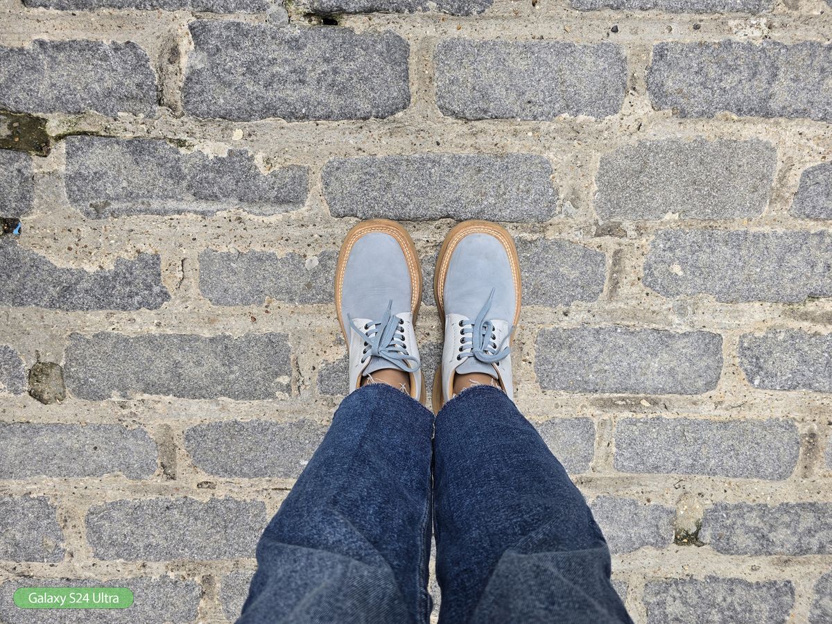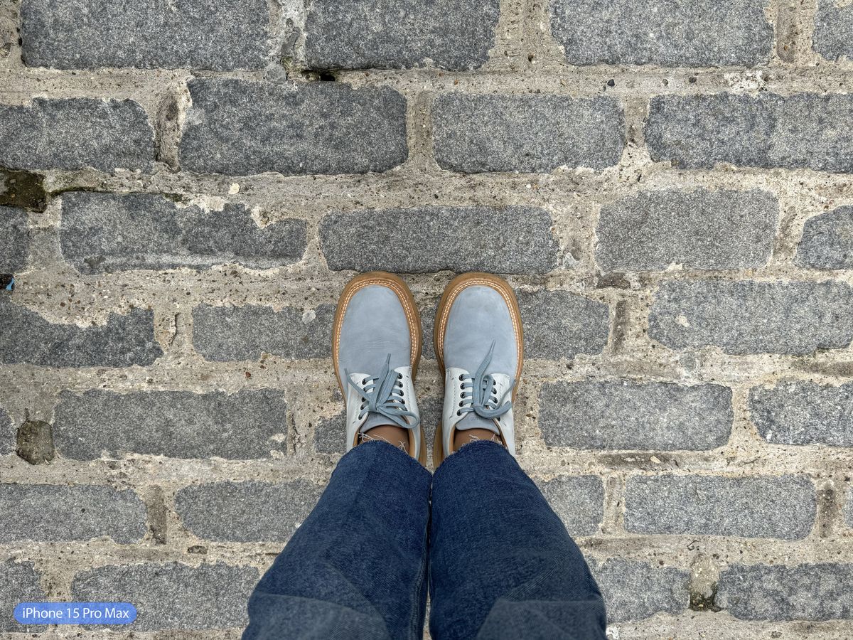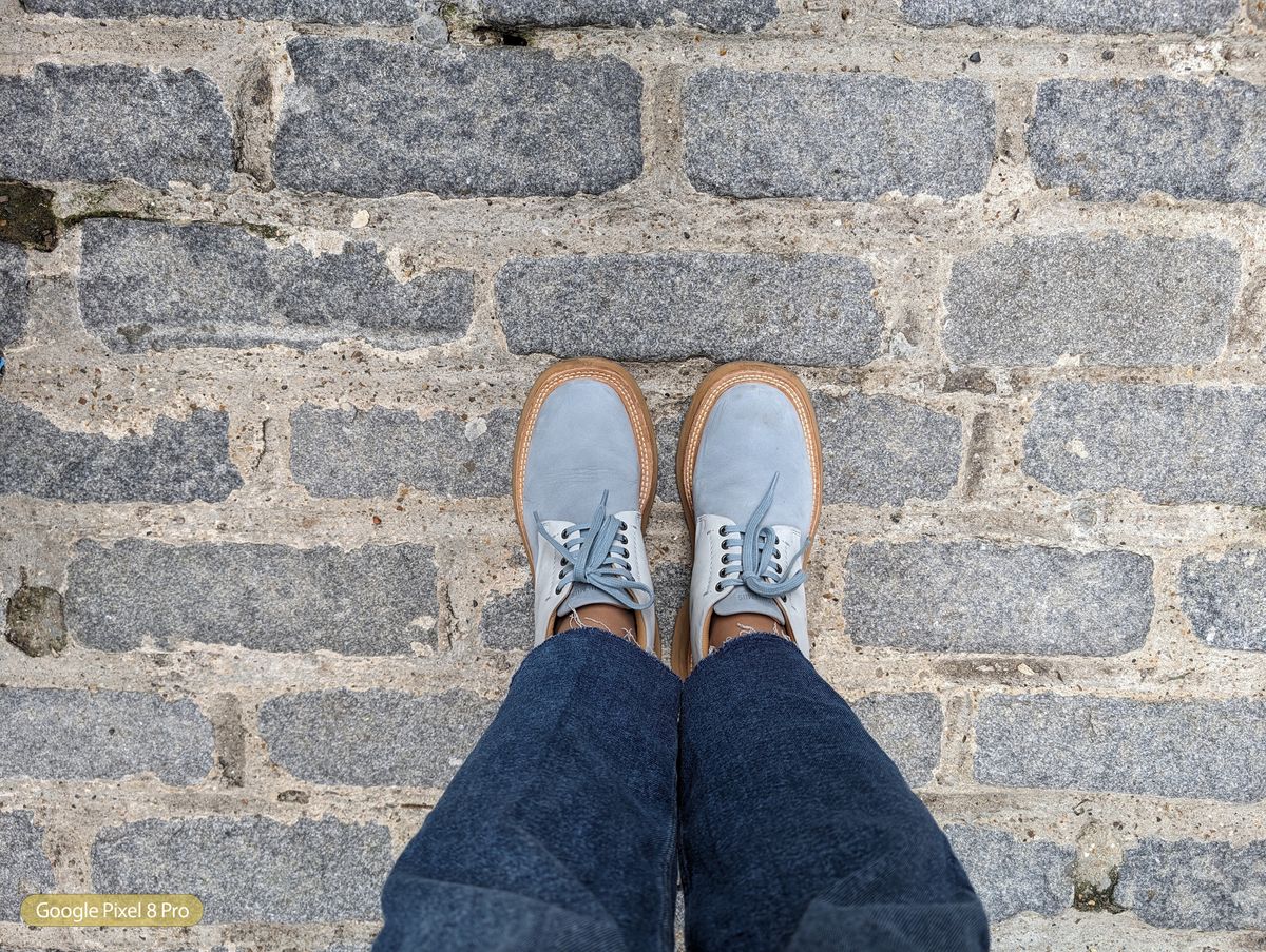 Далее — синие замшевые туфли, запечатленные на улице, на фоне полоски яркого облачного неба прямо над ними, между высокими зданиями, возвышающимися по обе стороны.