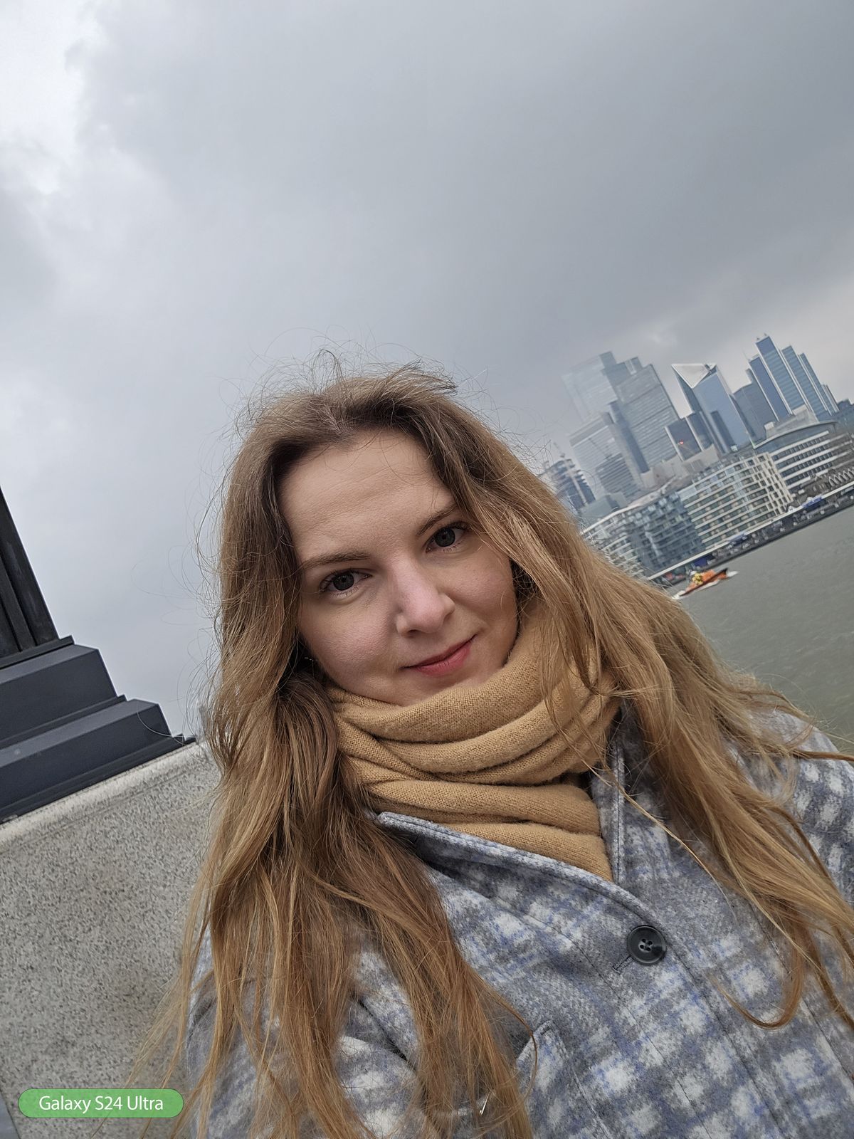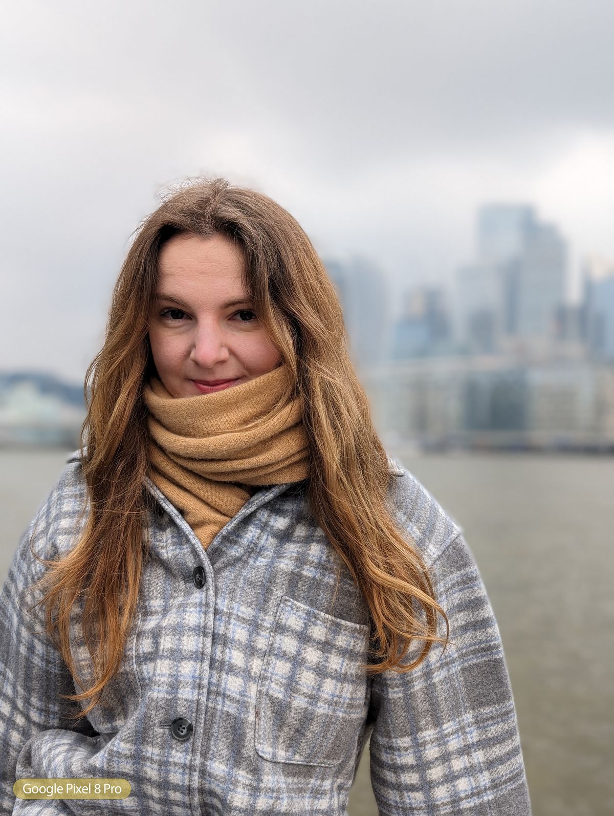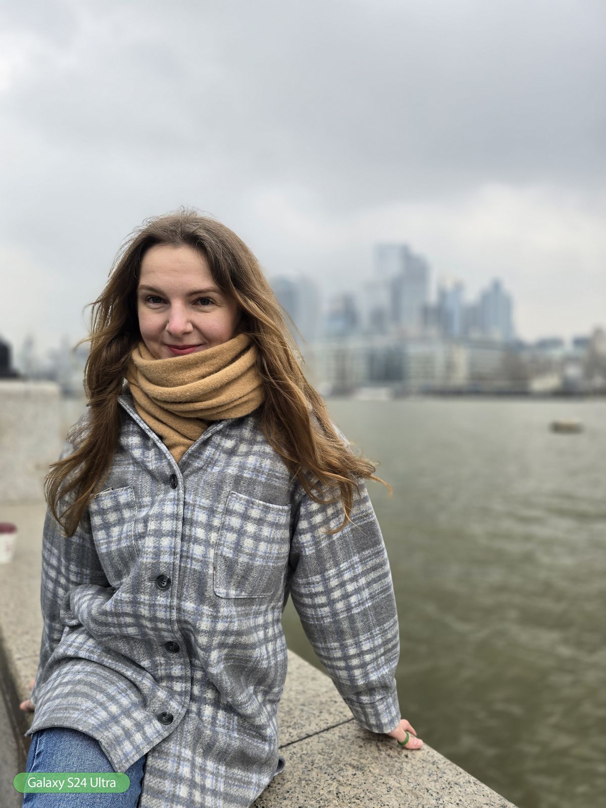 В отличие от Pixel, камера S24 Ultra также перекрасила всю сцену в другой цвет с легким зеленым оттенком. Однако она хорошо передала цвета и контрастность девушки. Благодаря крупному сенсору и объективу телефона, снимок стал чуть шире и с меньшей глубиной, что добавило естественной мягкости фону, но конечный результат оказался немного размытым.