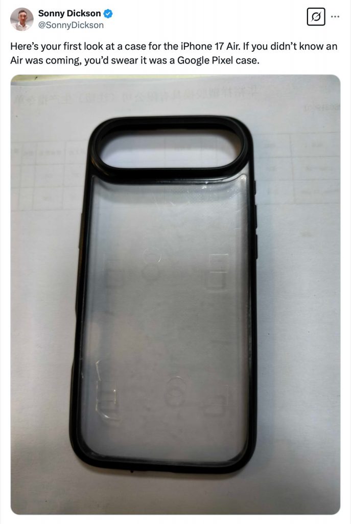 Судя по всему, в просочившемся в сеть чехле есть вырез для «рамки камеры» iPhone 17 Air — горизонтальной камеры в верхней части. Источник утечки Сонни Диксон поделился этим изображением, и важно знать, что не все его утечки подтвердились (хотя некоторые — да).