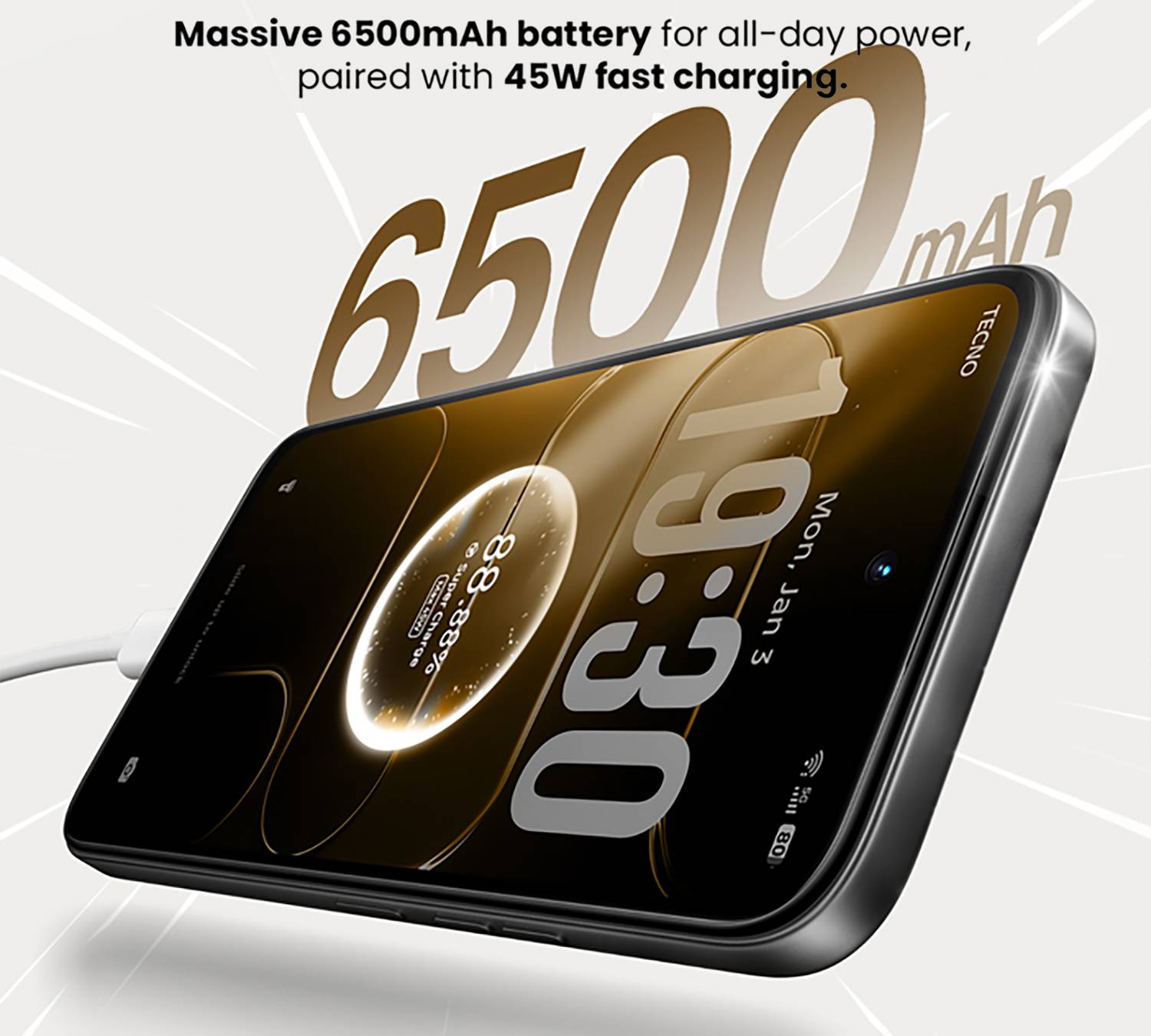 На странице товара наконец-то прояснили ситуацию с аккумулятором. Смартфон получил огромную батарею на 6 500 мАч. В комплекте идет быстрая зарядка мощностью 45 Вт. Это серьезный рывок вперед. Если вспомнить прошлую модель «Spark Go» (которую в некоторых странах знают как «Spark 40 5G»), там стоял аккумулятор на 6 000 мАч, а мощность зарядки составляла всего 18 Вт.