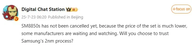 Digital Chat Station теперь утверждает на Weibo, что так называемый чипсет SM8850s еще не отменен. Сообщается, что этот номер модели может означать чип Snapdragon 8 Elite Gen 2 производства Samsung. Между тем, стандартный чип Snapdragon производства TSMC, по сообщениям, имеет номер модели SM8850.