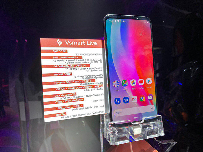 На презентации показали четыре модели. Самая интересная из них – Vsmart Live (14 990/16 990 рублей в зависимости от объема памяти). Аппарат оснащен тройной камерой с головным 48-мегапиксельным модулем, AMOLED-экраном со встроенным сканером отпечатков пальцев, мощным аккумулятором на 4000 мАч и чипсетом Qualcomm Snapdragon 675.