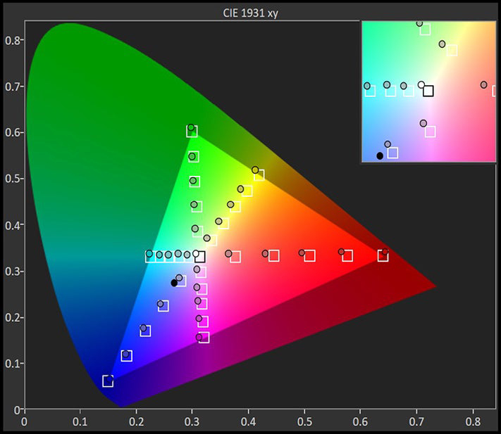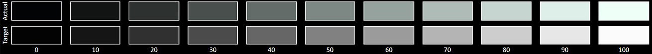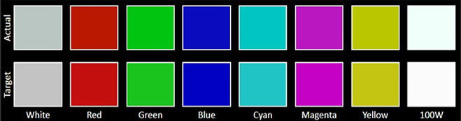 | Максимальная яркость (100% APL) | Минимум яркости | Цветовая температура | Гамма | Дельта E rgbcmy | Оттенки серого Delta E | |
