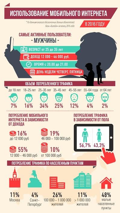 Абоненты в возрасте до 18 лет генерируют 7% от общего объема, люди от 64 лет – всего 2%. Женщины потребляют 43,3% информации, мужчины – 56,7%. Наиболее активны представительницы женского пола по воскресеньям, представители мужского – по четвергам. Те и другие чаще всего пользуются интернетом в восемь вечера.