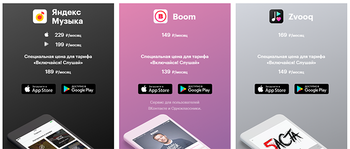 Первый месяц подписки на эти сервисы для абонентов «МегаФона» будет бесплатным. Дальше придется платить, но и здесь есть сюрприз: для тарифа «Включайся! Слушай» действует спецпредложение. Если стандартные цены на «Яндекс.Музыку», Zvooq и Boom составляют 229/199 (iOS/Android), 149 и 169 рублей в месяц соответственно, то с тарифом «Включайся! Слушай» они снижаются до 189, 139 и 149 рублей.