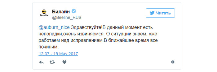 Позже аналогичные сообщения – о проблемах со связью – стали поступать и от абонентов «Билайна». Оператор подтвердил эту информацию в своем «Твиттере», однако позже твит был удален.