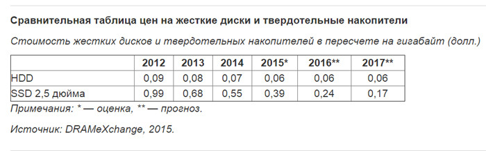 Твердотельные накопители в 2012 году в пересчете на гигабайт предлагались за 99 центов. В период с 2013-го по 2015 год их стоимость упала с 68 до 39 центов за гигабайт. Таким образом, средний твердотельный накопитель емкостью 1 Тбайт продается сейчас за 390 долл.