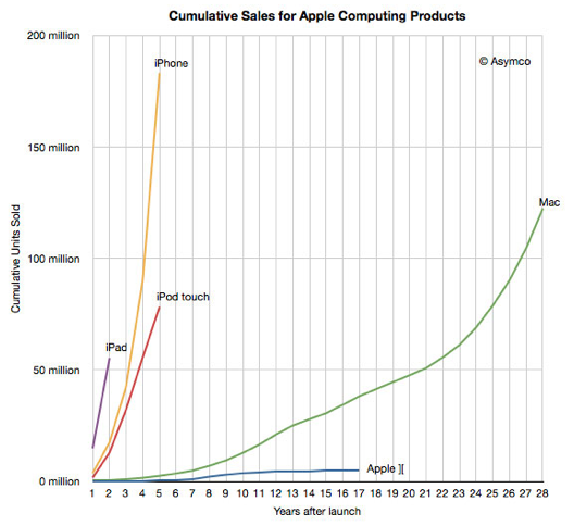 Аналитики Asymco, изучая статистику продаж Apple, обнаружили интересные результаты. Оказалось, что в 2011 году Apple продала устройств на iOS больше, чем компьютеров Mac за все время их существования, а это ни много ни мало – 28 лет. В прошлом году Apple продала 156 млн девайсов на iOS, тогда как общее количество проданных за 28 лет Mac составило 122 млн.