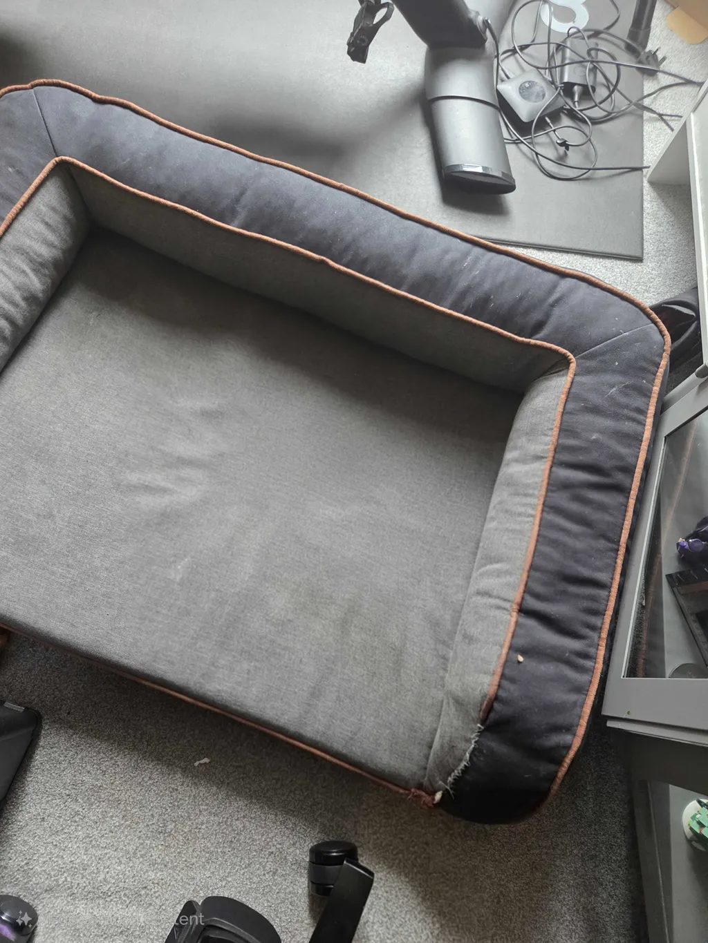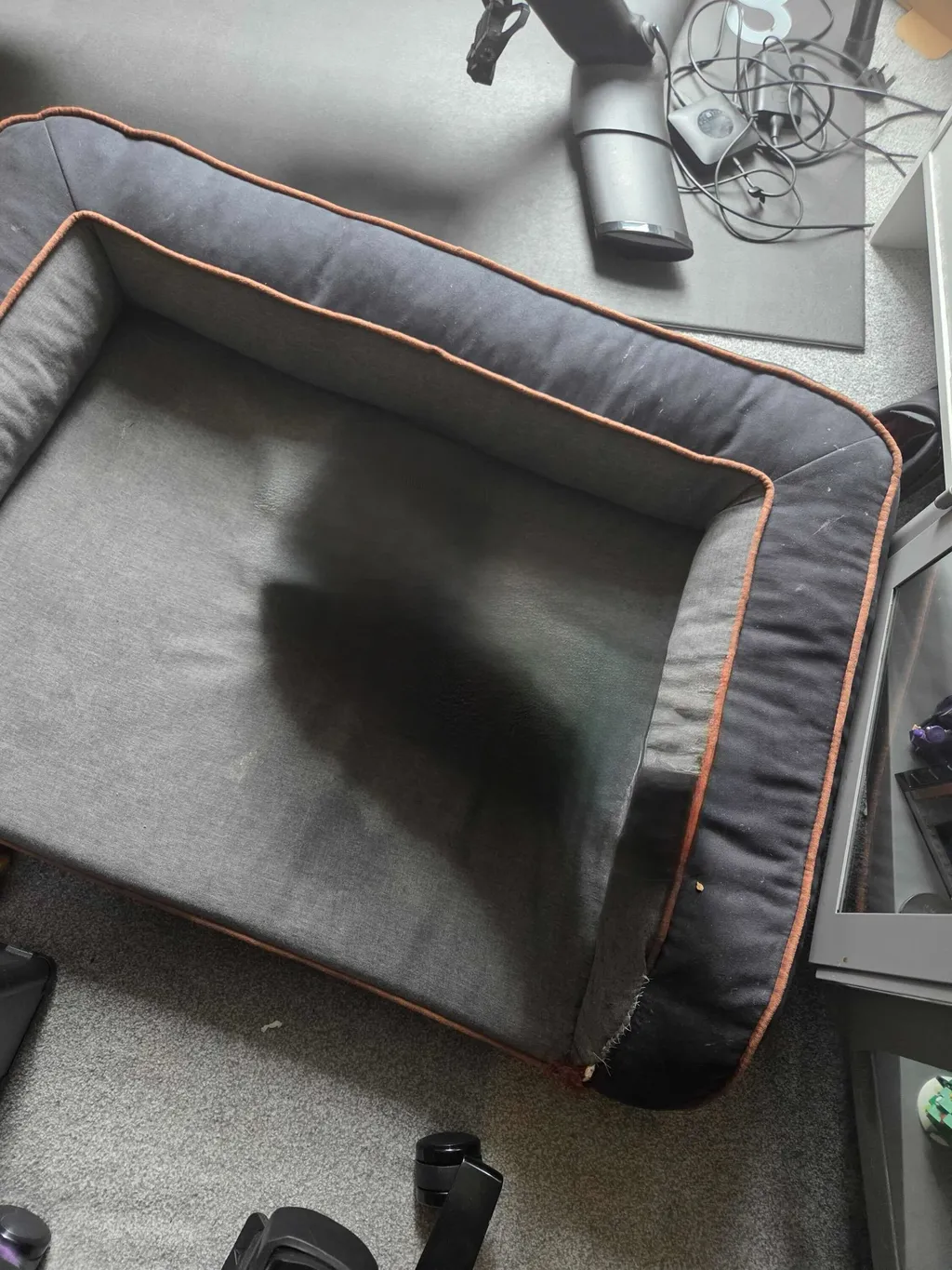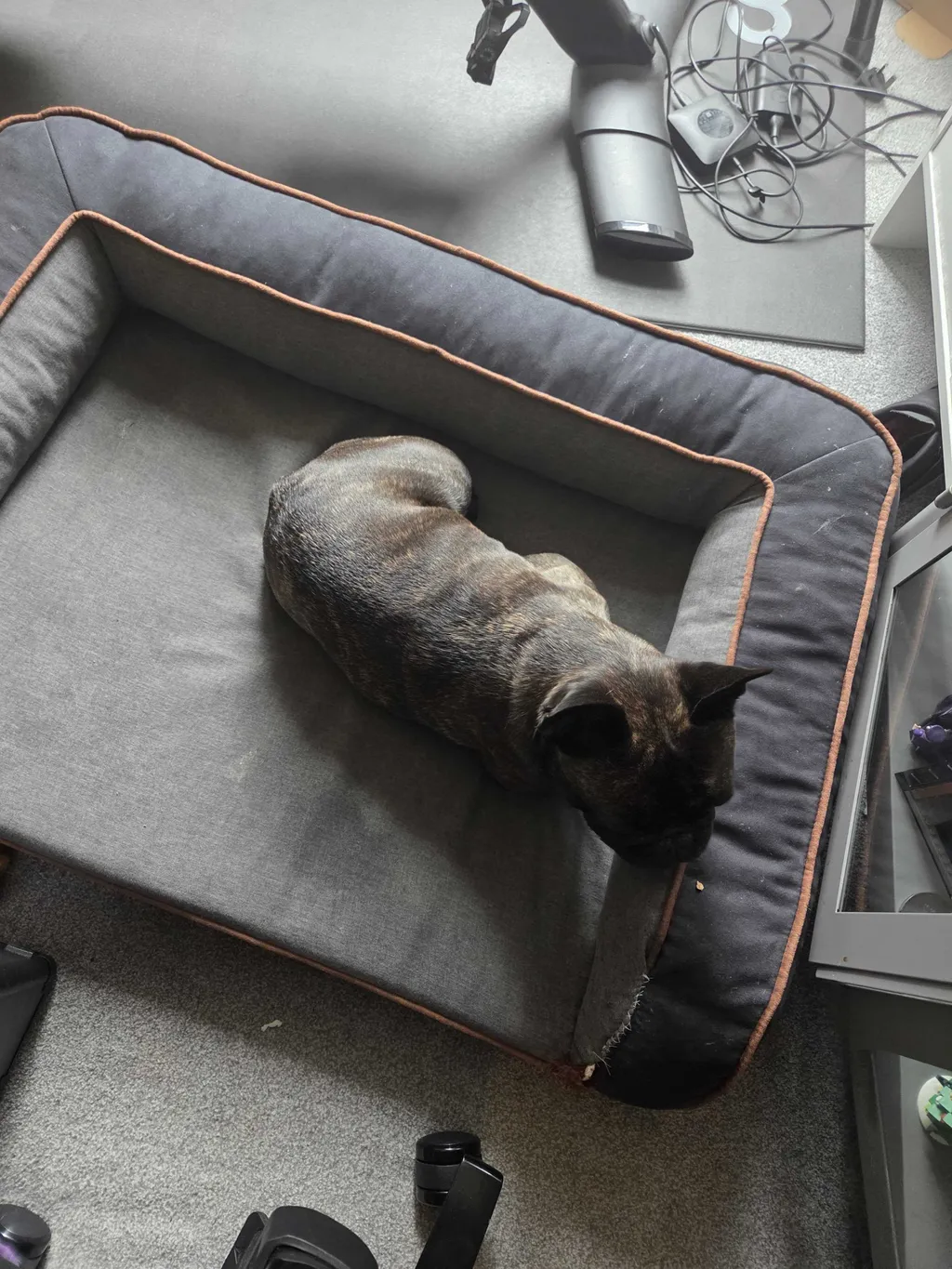 Чтобы начать сравнение Galaxy AI Generative Edit и Clean Up, я решил начать с того, что стёр своего французского бульдога Кермита с его очень простой серой кровати. Я подумал, что это хорошая отправная точка, так как, несмотря на то, что кровать — это простой фон, тень от собаки будет падать на естественный солнечный свет из окна перед камерой.