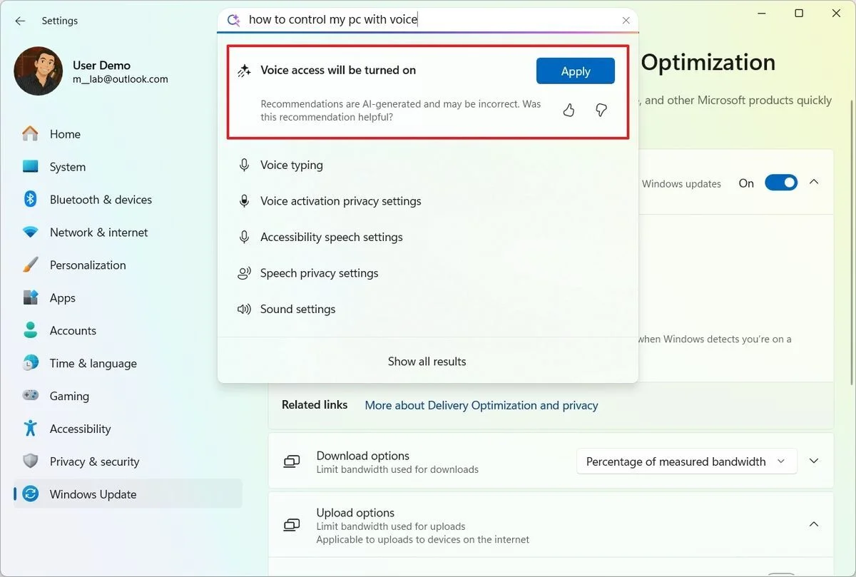 ИИ-агент должен начинать предлагать варианты в режиме реального времени по мере того, как вы печатаете. Когда вам будет предложена настройка, появится кнопка «Применить» (например, при активации голосового доступа), и при нажатии на неё функция будет автоматически включена.
