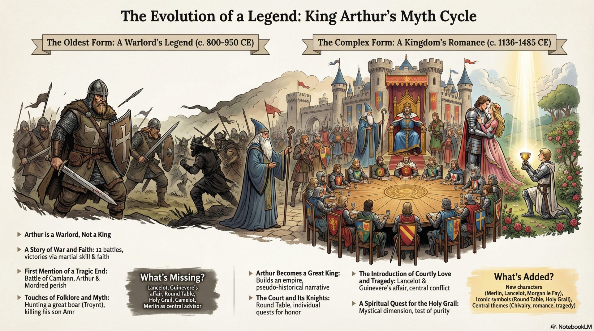 Nano Banana Pro и NotebookLM отлично справились с задачей. Они провели прямую визуальную и тематическую параллель между самыми ранними версиями мифа об Артуре (около 800–950 гг. н. э.) и более сложными средневековыми романами (1136–1485 гг. н. э.). Инфографика показывает, как суровый и воинственный первобытный миф превращается в пышный, изысканный и наполненный знаковыми элементами. Текст в целом был читабельным, но имел несколько недостатков, которые потребовали доработки.