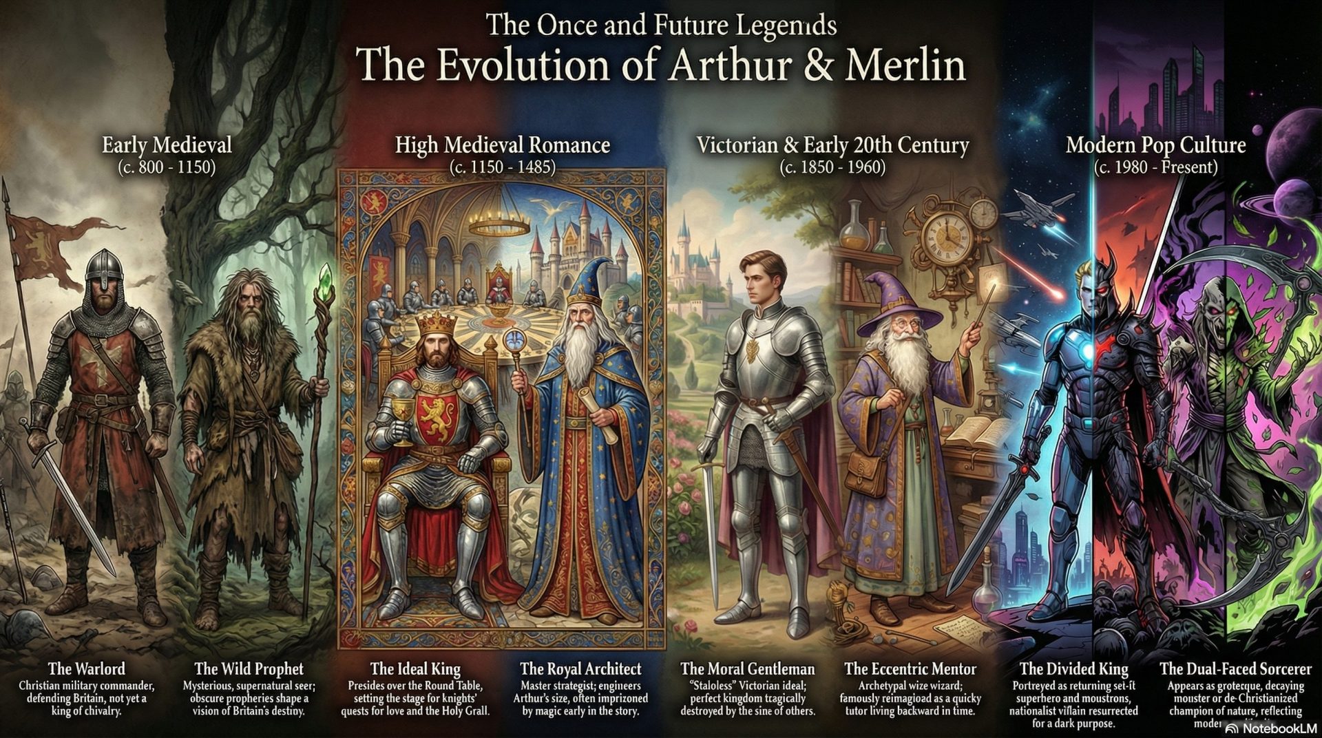 Для второй инфографики я хотел представить путешествие по историческим эпохам и показать, как менялись образы и роли Артура и Мерлина. Можно увидеть, как эта пара появляется в разных эпохах, каждый раз выглядя совершенно по-новому и получая новое имя и описание. Переходы во времени были не только визуальными, но и тематическими. Каждая пара отражала политику, мораль и эстетику своей эпохи. Nano Banana Pro сумел сохранить целостность персонажей при переключении между средневековьем и киберпанком, и это, честно говоря, впечатляет.