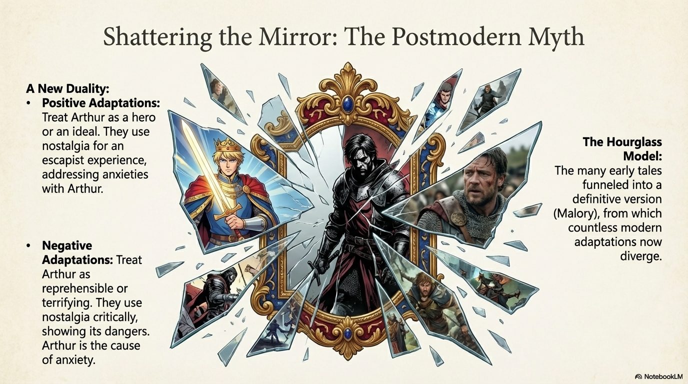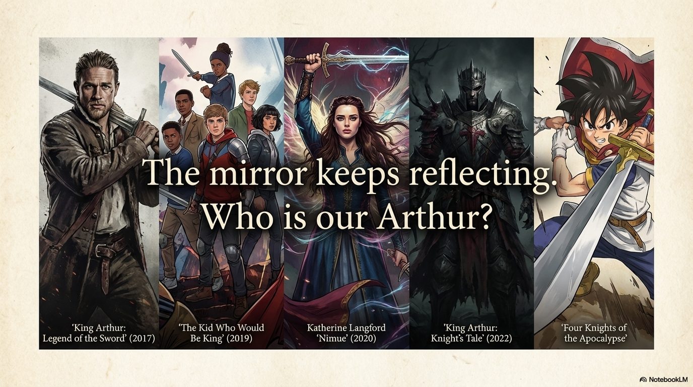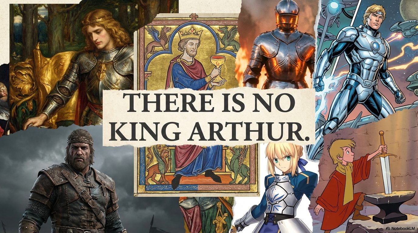 Начальный слайд мгновенно задает тон. Коллаж из персонажей артуровского цикла — от короля из средневековых рукописей до рыцаря из аниме, мрачного военачальника и сияющего паладина из научной фантастики — выстроен вокруг прямолинейного заявления «Короля Артура нет». Этот тезис заложен в дизайн и объявляет основную мысль презентации с большей уверенностью, чем большинство созданных человеком вступительных слайдов.