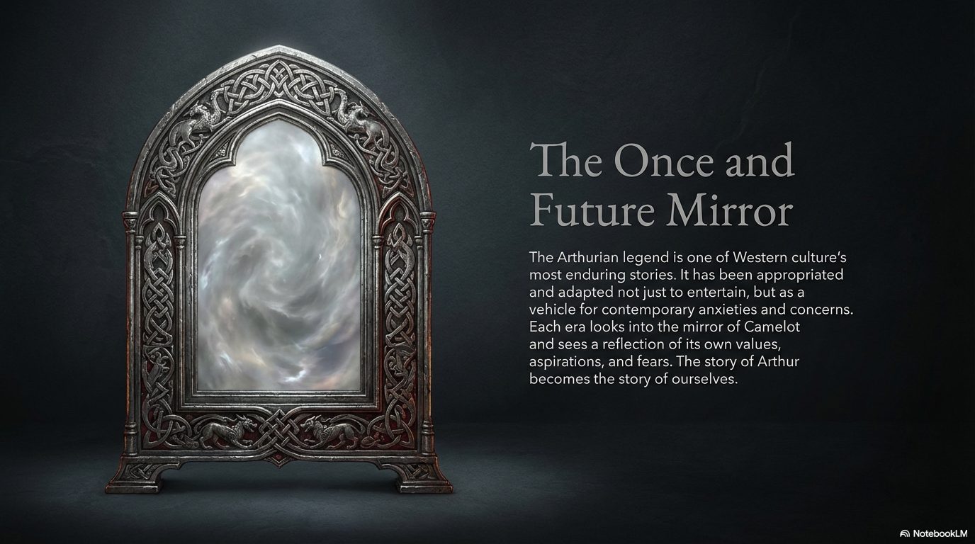 Для слайдов я попросил ИИ изобразить цикл мифов о короле Артуре на разных исторических этапах, от его первоначальной формы до XXI века. Через несколько минут NotebookLM представил проект «Артур: Бесконечное отражение». Я привел несколько примеров изображений выше, но это лишь часть из 15 слайдов, которые создали NotebookLM и Nano Banana Pro.