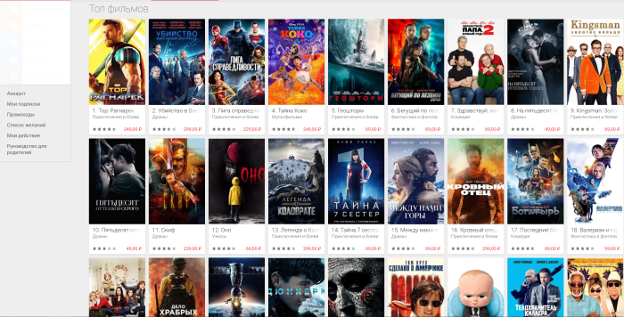 Вариант второй: Покупка фильмов в Google Play. Если вы категорически не любите Apple, то вам прямая дорога в магазин «корпорации добра» — Google. Здесь фильмы доступны по цене в 349 рублей за новинку, что на 50 рублей дешевле, чем у Apple. Бывает и ниже: 299 рублей за фильм. Аренда также доступна далеко не сразу, ее цена всего 69 рублей. Сервис «Google Play Фильмы» доступен как и веб-версии, так и в смартфонах и телевизорах на платформе Android.