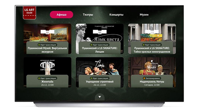 Так, оно позволяет посмотреть в прямом эфире трансляции спектаклей московских театров, записи концертов академической музыки, а также созданную LG в рамках партнерства с Пушкинским музеем серию виртуальных туров по экспозициям ГМИИ им. А. С. Пушкина и три цикла лекций-дискуссий об искусстве с художниками, искусствоведами, архитекторами, журналистами, дизайнерами и режиссерами.