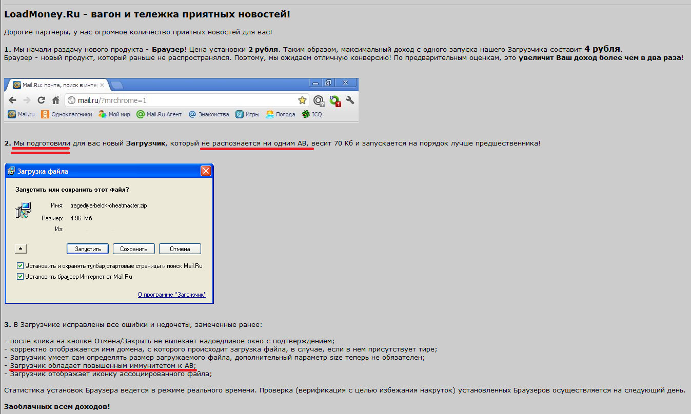 Согласно результатам опросов, проведенных на официальном форуме «Доктор Веб», а также в тематической группе социальной сети Facebook, подавляющему большинству пользователей доставляют значительные неудобства «самоустанавливающиеся» панели, браузеры и другие утилиты от Mail.Ru, в частности программа «Спутник@Mail.Ru». Официальная позиция самой компании Mail.Ru Group, высказанная на одном из сайтов, заключается в том, что Mail.Ru не работает напрямую с платными архивами. Действительно, обвинять Mail.Ru в создании платных архивов было бы по меньшей мере глупо: столь крупная и известная компания не может заниматься подобными вещами. Зато, судя по всему, вполне может сотрудничать «не напрямую» с партнерскими программами, специализирующимися на распространении Trojan.SMSSend и других опасных угроз. Известно, что у Mail.Ru Group имеется компания-партнер, которую они называют «крупнейшим в русскоязычном Интернете агрегатором download-трафика». В свою очередь, данный агрегатор владеет партнерской программой LoadMoney.Ru, с использованием которой пользователям раздается утилита «Загрузчик@Mail.Ru». Показанное на иллюстрации рекламное объявление говорит само за себя.