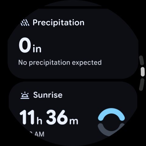 Также есть плитки для информации о погоде, УФ-индексе и закате. Эти экраны уже были видны в листинге приложения Pixel Weather в Play Store.