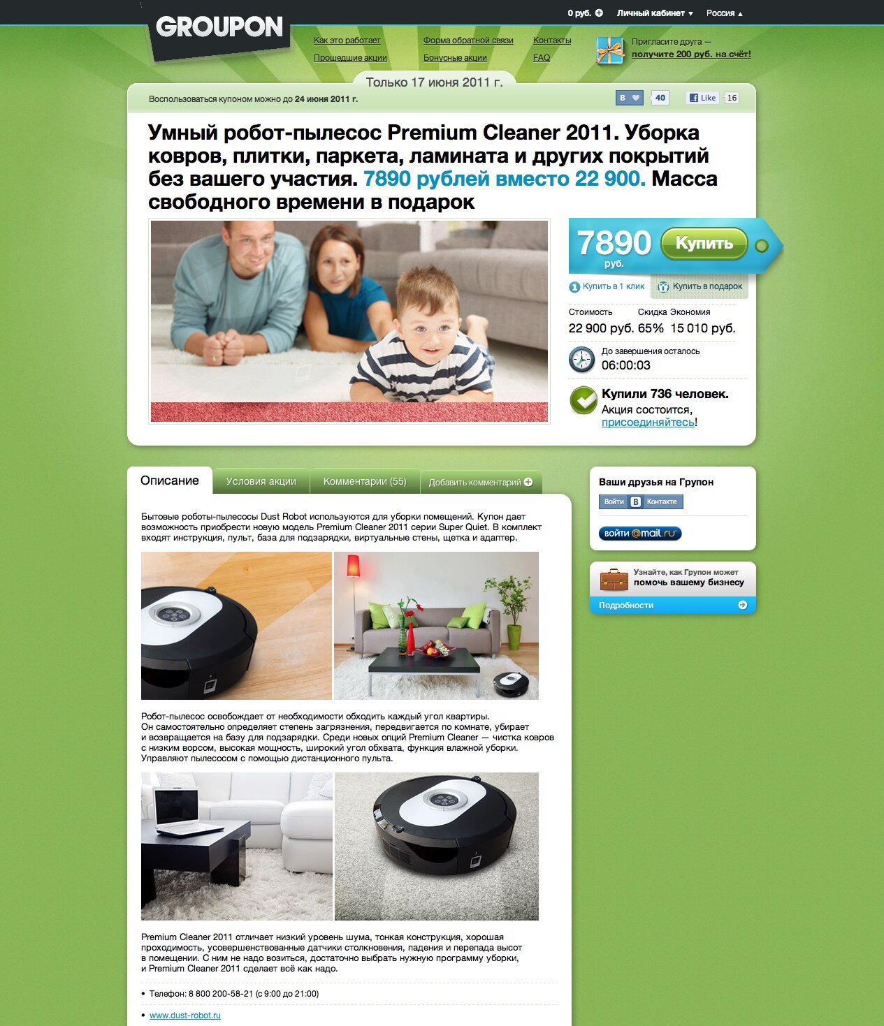 “Я чуть не повелась на обман. Увидела на Groupon.ru робот-пылесос, произведенный в Германии, с огромной скидкой! Оригинальная цена — 23 000 руб., по акции — 8000 руб. Скажу честно, в этих пылесосах не понимаю ничего, но знаю примерный порядок цен на них. В общем, сумма в 23 000 руб. свидетельствовала о том, что перед мной какой-то очень достойный аппарат уважаемого бренда, а скидка в 15 000 руб. просто выключила мне голову. Я уже почти решила заплатить 8000 руб., но потом подумала, что сперва следовало бы посоветоваться с мужем. Тот отнесся к акции с подозрением и правильно сделал.