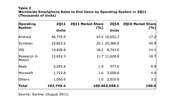 Уважаемая аналитическая компания Gartner выпустила свой отчет о распределении сил на мобильном рынке. Если вы удивляетесь, почему Apple вдруг так ополчилась на Android и судится с производителями «гуглофонов», достаточно взглянуть на эти цифры.