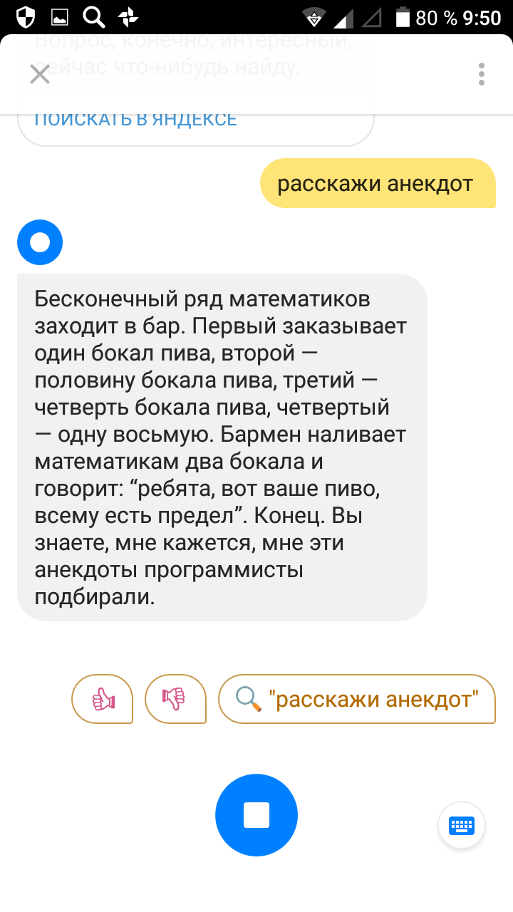 Любой ответ Алисы можно оценить. За хорошую оценку бот поблагодарит, поставите плохую — попросит уточнить, в чем проблема.